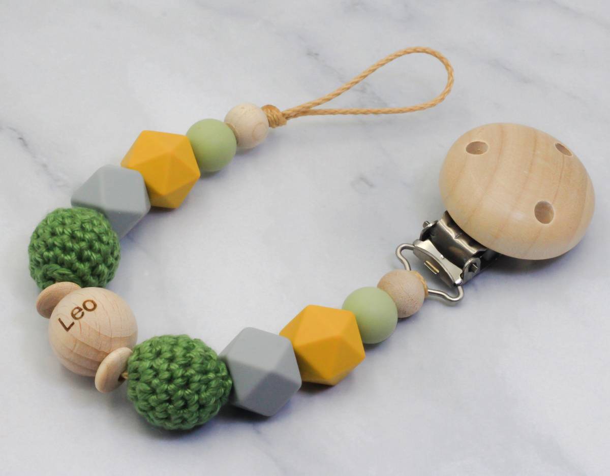 Schnullerkette mit Name, natur, ocker, oliv, hellgrau und lind